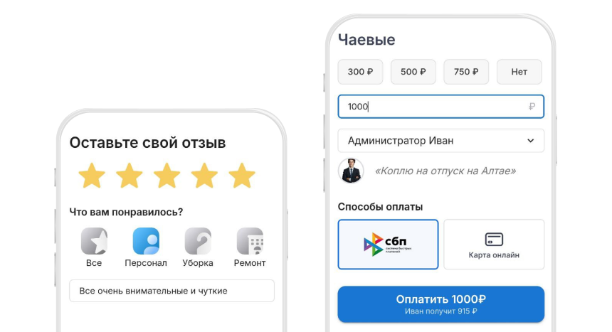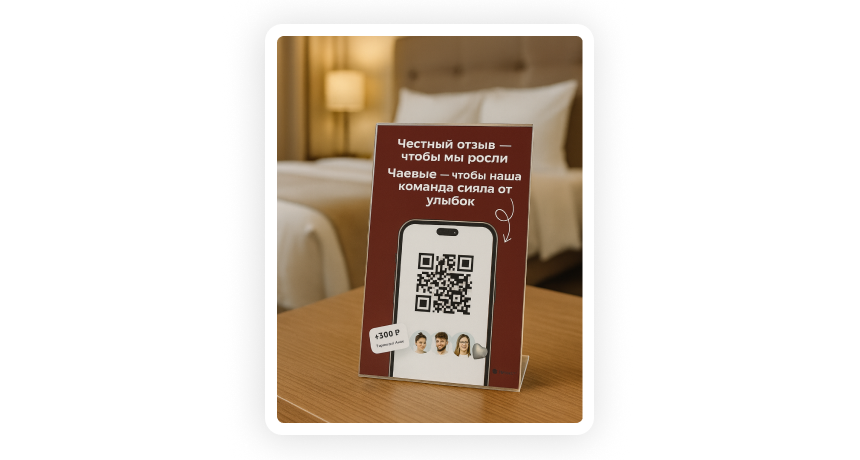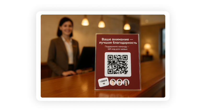 Каждый номер получает уникальный QR-код. Гость сканирует код и оставляет чаевые с комментарием, например: «Отличная уборка и вид из окна».