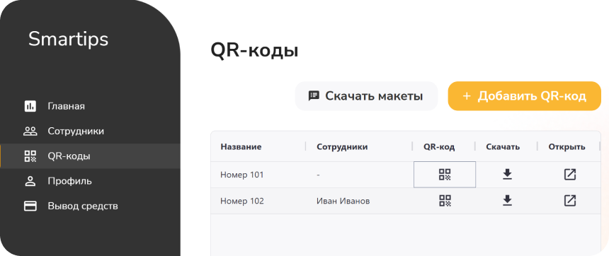 Администратор создает QR-коды для номеров, зон (ресепшен, ресторан, спа), команд, смен или мероприятий. Каждый код ведет собственную статистику чаевых и отзывов.